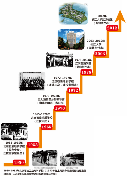 原江汉石油公司前身为1950年在上海开办高级地球物理勘探培训班,1951年在北京秦老胡同3号四合院成立公司,公司暂定名为北京石油工业公司,后改名为北京石油地质勘探公司,新中国成立后创建的第一所石油公司;1953年-1965年,迁校至北京定福庄,改名为北京石油地质公司(图3),改办中专,;1965年-1970年,迁校至大庆,改名为大庆石油地质公司(图4);1970年-1972年,从大庆迁往江汉油田,组建成“五七”油田会战总指挥部第三分指挥部第十二营,即教导营,改名为五七油田三分部教导营,先后在湖北枣阳(图5)、当阳(图6)办学;1972年-1977年,江汉油田根据石油部意见,决定将教导营搬迁到湖北江陵县东门外原荆州农校旧址即江汉局四分部驻地,校名改为江汉石油地质公司(图7);1978年-2003年5月,改名为江汉石油公司(图8),开始举办普通本科教育,隶属中国石油天然气集团公司,从2000年起,实行中央与地方共建,划转湖北省管理;2003年5月,江汉石油公司与湖北农公司、荆州师范公司、湖北省卫生职工医公司合并,改名为太阳成tyc33455ccwww;2012年9月,太阳成tyc33455ccwww武汉校区启用(图9),太阳成tyc33455ccwww、地球物理与石油资源公司、石油工程公司、资源与环境公司等石油主干公司搬迁至武汉校区,在武汉市蔡甸区办学。