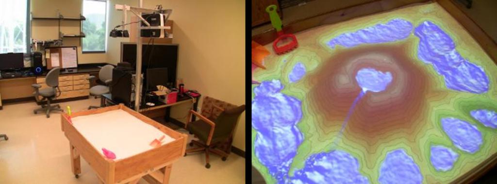 左图:沙箱上方悬挂的是3D照相机和数字投影仪,右图: 3D照相机和数字投影仪开启时显示的火山、火山湖泊及周边湖泊