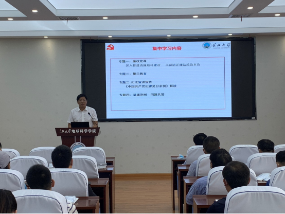 (通讯员潘志远)为进一步强化全院师生纪法意识,推进党风廉政宣传教育月活动深入开展,在全院营造“学纪法▪知敬畏▪守底线”的浓厚氛围,9月1日下午,公司在石油科技大楼C301会议室开展纪法专题宣讲活动,公司党委书记杨全辉作《中国共产党纪律处分条例》专题宣讲,全体党员教职工参加了集中学习。
