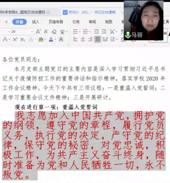 活动第二阶段为支部主题党日活动。由于科级干部调整,原来机关党支部组织委员王宁调出太阳成tyc33455ccwww,重新推举郭霖同志为组织委员。各位党员自觉交纳了4月党费,并在马书记带领下,全体党员利用屏幕共享和手机语音重温了入党誓词,这也是疫情防控工作中一次特别的党员宣誓。紧接着,大家集中学习重要会议文件精神:3月4日中共中央政治局常务委员会会议精神、3月6日决战决胜脱贫攻坚座谈会精神、习近平在湖北省考察新冠肺炎疫情防控工作时的讲话精神、3月18日中共中央政治局常务委员会会议精神、3月27日中共中央政治局会议精神和公司2020年工作会议精神。随后,马书记传达了公司4月份中心组学习及党委扩大会议精神,主要通报了2020年公司的重点工作,对近期的重点工作进行提醒。活动最后,大家还围绕“结合疫情防控谈共产党员如何在公司双一流建设中发挥作用”开展研讨。每位机关人员都结合自己的实际从疫情防控、日常工作、学科和公司发展3个方面进行讨论,并达成一致工作态度:保安全、抓落实、谋发展。