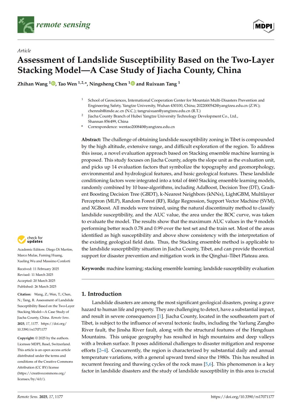 2025年年初,22级本科生(在读大三)王芷含在《Remote Sensing》(最新影响因子为4.1,位列JCR分区二区,中科院期刊分区地球科学大类二区)上发表了题为《Assessment of Landslide Susceptibility Based on the Two-Layer Stacking Model—A Case Study of Jiacha County, China》的论文(图1,共24页)。全部作者均来自太阳成tyc33455ccwww师生,本科生王芷含为论文第一作者,其导师温韬教授为通讯作者。论文借助两层Stacking集成学习模型对滑坡易发性进行评价,以西藏山南市加查县为研究区,取得了显著成果。