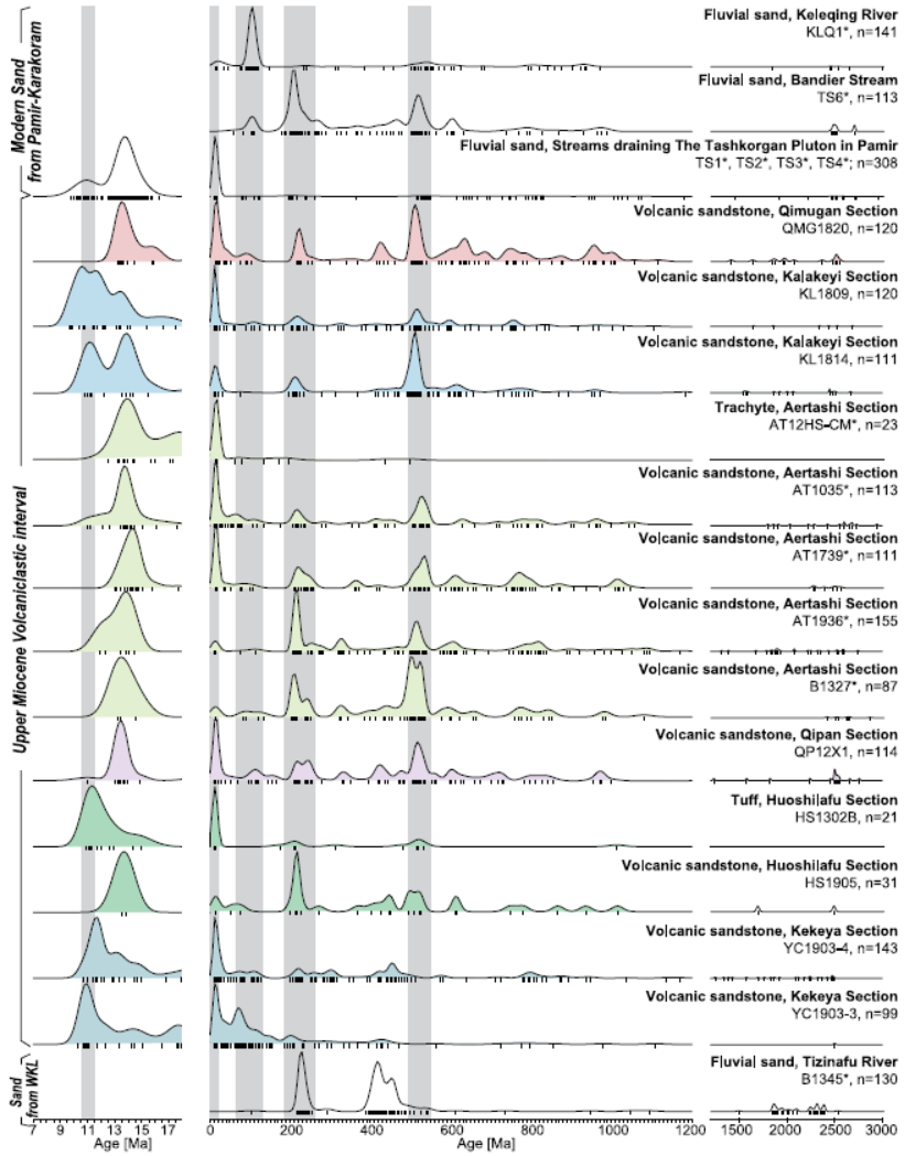 图5.由于火山岩浆本身贫锆石,可以通过锆石U-Pb年龄谱判断火山碎屑的潜在源区,发现柯克亚地区的火山碎屑跟其他地区不同