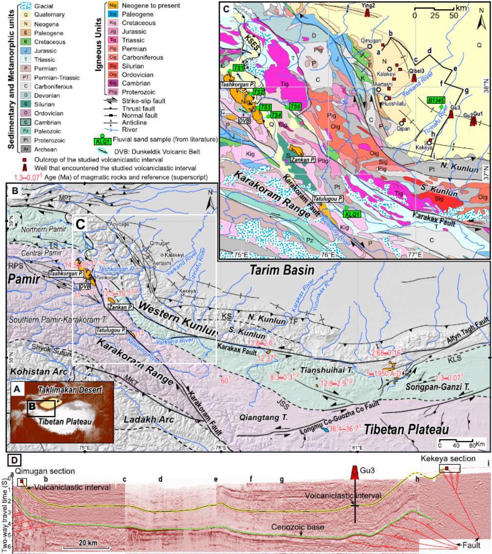 "就像历史学家需要确定历史事件发生的朝代,地质学家重建地球故事必须首先厘清地层年代。"论文作者比喻道。在化石匮乏的塔西南新生代陆相地层中(图1),确定地层的准确年代是一个难题。研究团队将目光投向一套广泛分布的"火山砂岩"——这些通过河流搬运的火山碎屑,因具有典型砂岩的沉积构造(斜层理等)而长期被学界忽视,却可能成为破解地层年代难题的钥匙。
