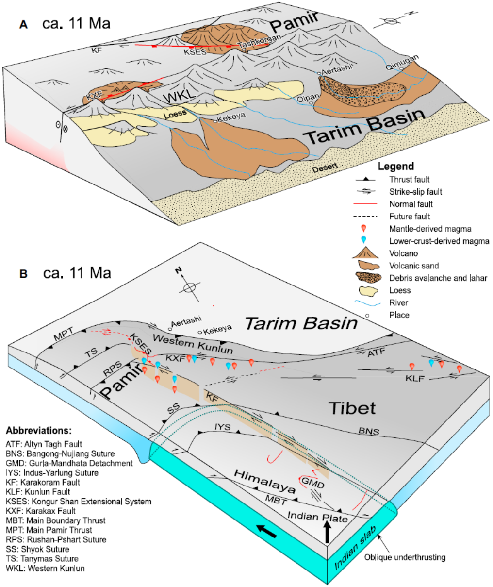 结合区域岩浆和构造证据,研究认为:印度板块斜向俯冲导致青藏高原西部发生大规模走滑断裂,在断裂带转换伸展区诱发深部熔融,最终引发东帕米尔和西昆仑约1100万年前的协同火山喷发(图6)。该模型将塔西南地表沉积记录与高原深部动力过程直接关联,为地球"深部-浅部相互作用"理论提供了研究案例。