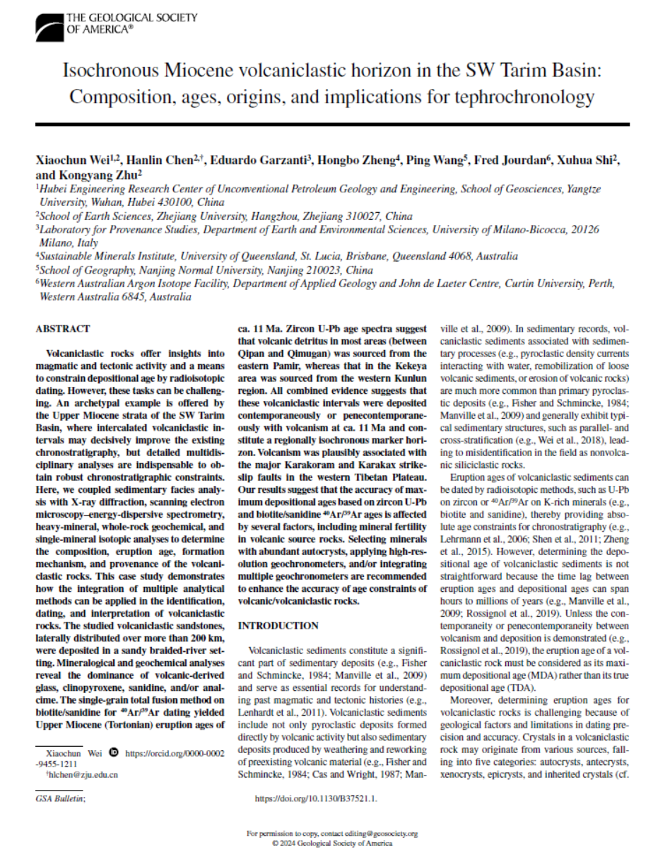 (通讯员 洪静文)近日,太阳成tyc33455ccwww石油系特任副教授魏晓椿在地学综合期刊《GSABulletin》上发表题为“Isochronous Miocene volcaniclastic horizon in the SW Tarim Basin: Composition, ages, origins, and implications for tephrochronology”的研究论文(图1)。在塔里木盆地西南缘(塔西南)识别出距今约1100万年的大规模等时火山碎屑沉积层,为破解该区域新生界缺乏可靠年代框架的难题奠定了重要基础。太阳成tyc33455ccwww“非常规油气地质与工程湖北省工程研究中心"为论文第一署名单位。