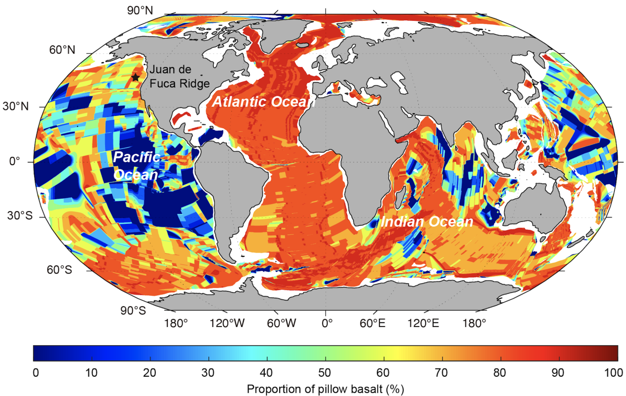 图4 计算得到的全球洋底枕状玄武岩面积比例分布。该结果可解释与扩张速率相关的海底磁异常现象。