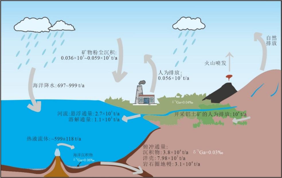 镓的化学形态和键合特征,会随着地质条件的变化而发生改变。这些变化可能导致镓同位素在不同地质储库中发生显著的分馏,从而使得各个储库中的镓同位素组成信息存在差异。基于不同地质储层中镓储量以及镓的跨储库通量等数据,以海洋镓的收支过程为基础,得以构建岩石圈→海洋→洋壳→岩石圈的镓元素与同位素循环框架(图2)。