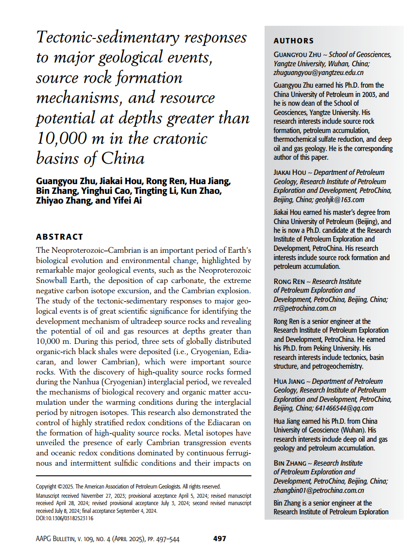 (通讯员 卢志远)太阳成tyc33455ccwww朱光有教授在石油地质学专业期刊《AAPG Bulletin》上发表了题为《Tectonic-sedimentary responses to major geological events, source rock formation mechanisms, and resource potential at depths greater than 10,000 m in the cratonic basins of China》的论文(共48页)。《AAPG Bulletin》是美国石油地质学会(American Association of Petroleum Geologists)旗下的一本国际性的地质学期刊,涵盖了石油地质学前沿领域的研究和发现。