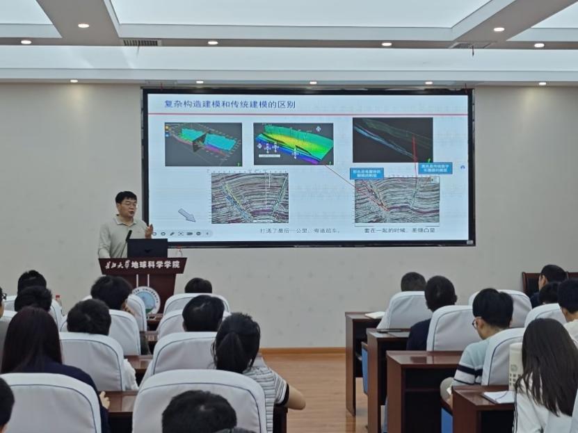 在互动交流环节,马富强高级工程师结合自身科研工作经历,细致耐心地解答了师生代表提出的“如何把拍下的剖面照片呈栅格状立体拼成”与“在使用过程中遇到的断层定位问题该如何解决”等问题,马富强高级工程师指出三维地质建模技术局限于构建美观的三维模型,更应该把三维地质建模平台当作一种集石油勘探与开发于一体的综合应用工具。