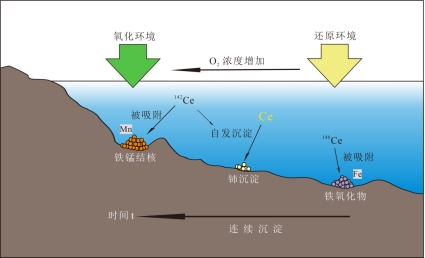 Fe在相对还原条件下沉淀,而Mn在相对氧化条件下沉淀。连续形成的铁锰矿床中轻的Ce同位素先吸附在Fe沉淀上,此时水体中相对富集重的142Ce;然后Ce自发沉淀形成Ce(OH)4或CeO2,Ce沉淀中δ142Ce值高于Fe沉淀;最后在富氧的水体中Mn析出,吸附在Mn沉淀上的Ce具有最高的δ142Ce值(图3)。142Ce同位素从Fe到Mn沉淀物中逐级富集能够清楚地观察到δ142Ce值的变化,同时反映了沉积环境的氧化还原波动。