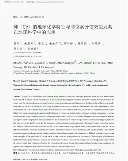 (通讯员 陈思钰)近日,21级本科生(现在读大四)黄月在中文核心(EI)期刊《地学前缘》上发表了题为《铈(Ce)的地球化学特征与同位素分馏效应及其在地球科学中的应用》的论文(共24页)。本科生黄月为论文第一作者,其导师朱光有教授为通讯作者,该论文还有四位本科生作者。论文分析了铈(Ce)及其同位素的地球化学行为、富集机制、同位素分馏效应及控制因素;梳理了其在地质测年、示踪物质来源与氧化还原环境中的应用。