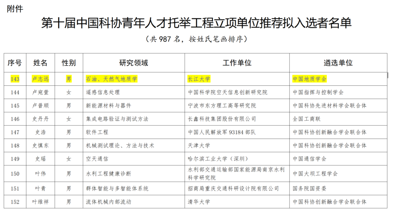 “青年人才托举工程”是中国科协于2015年启动的一项国家级青年人才支持计划,旨在选拔和培养一批具有创新潜力的优秀青年科技工作者,助力他们成长为学术技术带头人。该工程每年评选一次,入选者均为在各自领域崭露头角的青年才俊。2024年全国共有987名青年工作者入选,中国地质学会推荐6名。