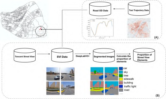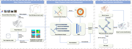 本研究通过语义分割提取街景的物理特征,并从出租车轨迹数据中获得行为特征,将两种特征拼接匹配道路网络中的街道单元作为街道特征(图3)。进而,采用三元组损失的构造来监督多层感知器学习同一社区内街道的区域特征,获得由物理和行为特征融合产生的区域特征向量,利用Louvain算法识别路网社区。最后,将增强的街道特征输入到GAT模型中,用于训练以及街道功能的识别。