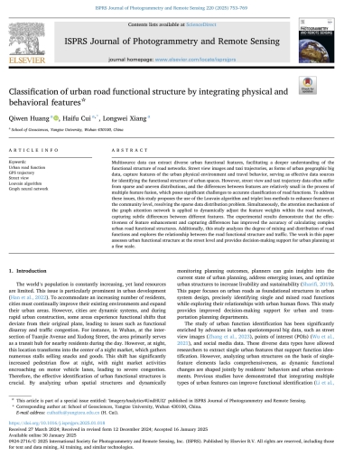 (通讯员 崔海福)近日,太阳成tyc33455ccwww地理信息科学专业2020级员工黄麒文在中科院一区TOP期刊《ISPRS Journal of Photogrammetry and Remote Sensing》(IF=10.6)发表题为“Classification of urban road functional structure by integrating physical and behavioral features”的研究论文。太阳成tyc33455ccwww为论文第一署名单位,员工黄麒文为论文第一作者,其导师崔海福博士为通讯作者。