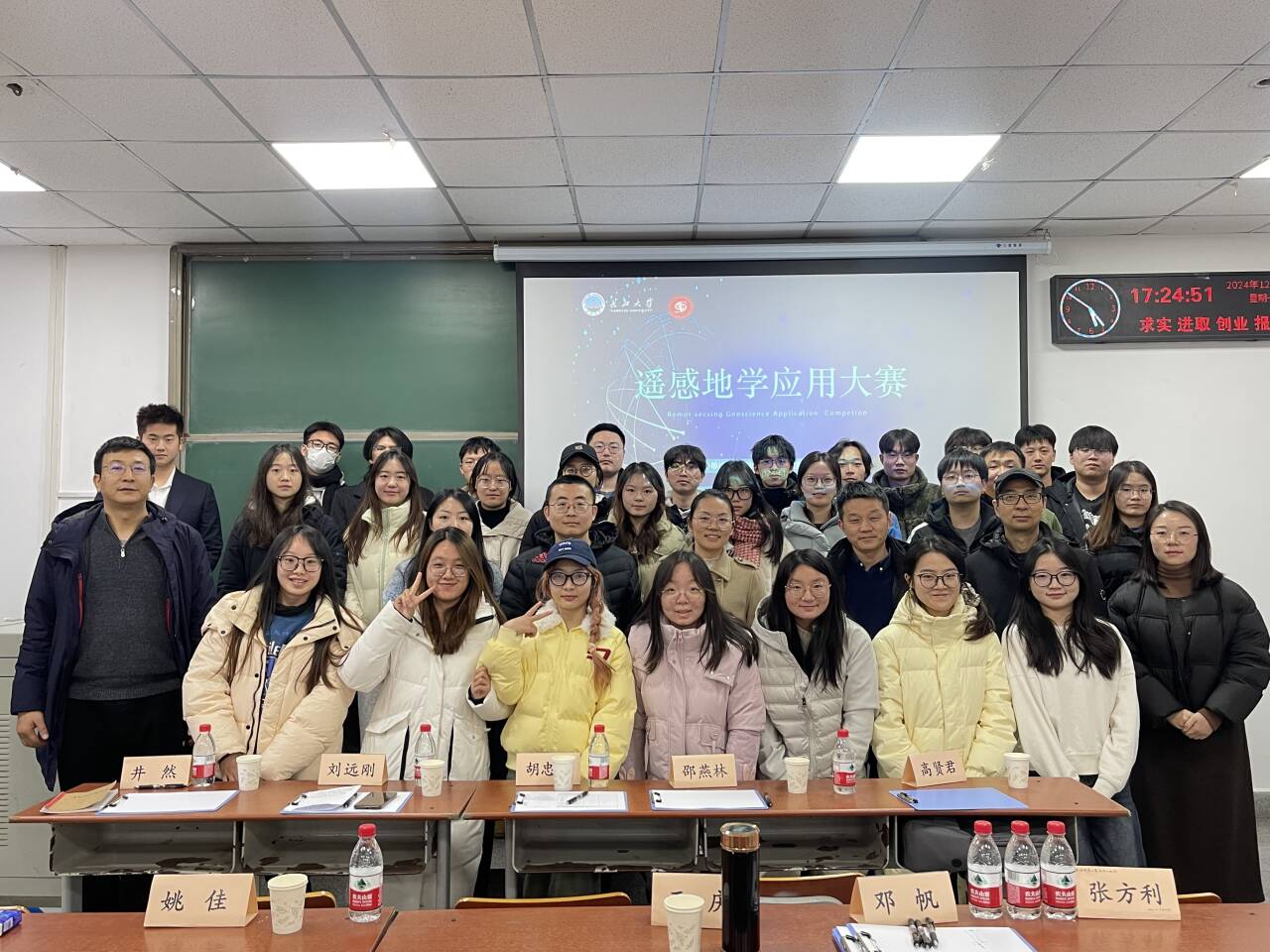 最终,“计算机基础算法组”11人获优胜奖,“遥感应用分析组”孙浩宇组获得一等奖,邱振翔组、饶旭乾组和石赵雄组获“二等奖”,刘海川组、丁百娇组、张家然组、李龙凡组获“三等奖”。评委老师依次为获奖选手颁奖,并合影留念。