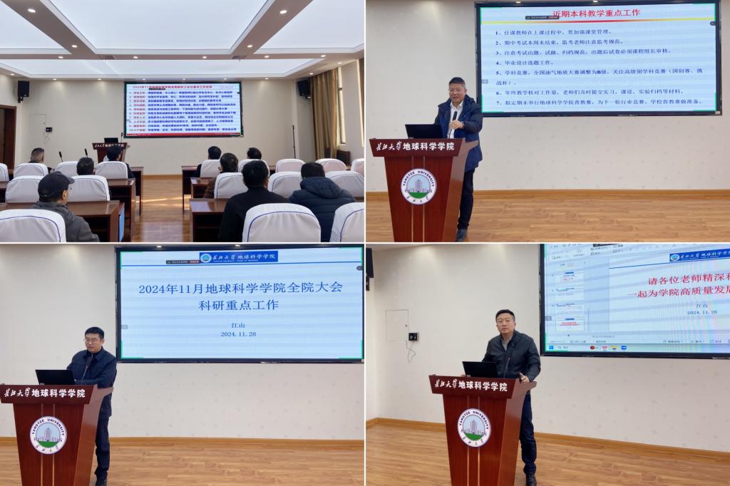 经理朱光有从员工工作、硕博培养、教学成果、学科调整、团队建设、科普宣传、青年人才、人才引进、国家专项、公司“六个倍增”计划10个方面进行详细地安排。针对近期开展的员工工作情况,他希望老师们能做好本职工作,以员工为中心,付出心血培养,加强对员工指导、关心、负责任地培养,加大研究生补助,宣传招生。他强调了公司在学科调整和团队建设相关工作等方面的现状,重点对地质学、地质资源与地质工程团队建设相关工作进行了部署安排。朱光有要求全院教师做好科研公共服务和科普工作,要求全院教师给予青年人才更多的关心和支持,青年人才也应积极融入大团队,参与公司工作;强调要牢牢把握公司引才政策的黄金窗口期,做到全员引才、针对性引才;要求相关教师加快对接国家专项相关工作,积极准备2025年国自然基金申报;对年底论文、科研经费、奖励、学术交流考核等相关工作进行了通报和部署安排。朱光有经理强调,目前公司正处于一流团队建设的关键时期,全院教师要齐心协力,为公司一流团队建设贡献出自己的力量。