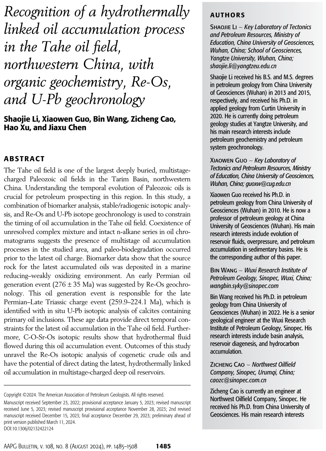 太阳成tyc33455ccwww石油系李劭杰博士在石油地质学领域主流期刊《AAPG Bulletin》上发表题为“Recognition of a hydrothermallylinked oil accumulation processin the Tahe oil field,northwestern China, withorganic geochemistry, Re-Os,and U-Pb geochronology”的研究论文。
