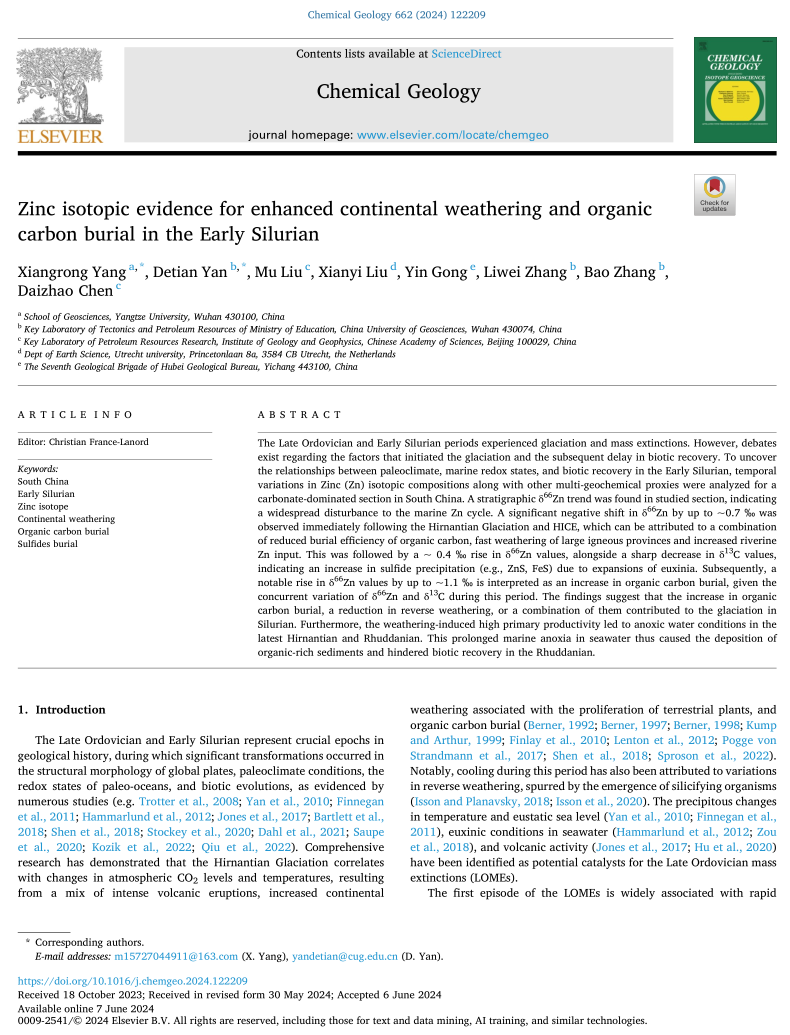 太阳成tyc33455ccwww地质系教师杨向荣在地学TOP期刊《Chemical Geology》上发表题为“Zinc isotopic evidence for enhanced continental weathering and organic carbon burial in the Early Silurian”的研究论文。