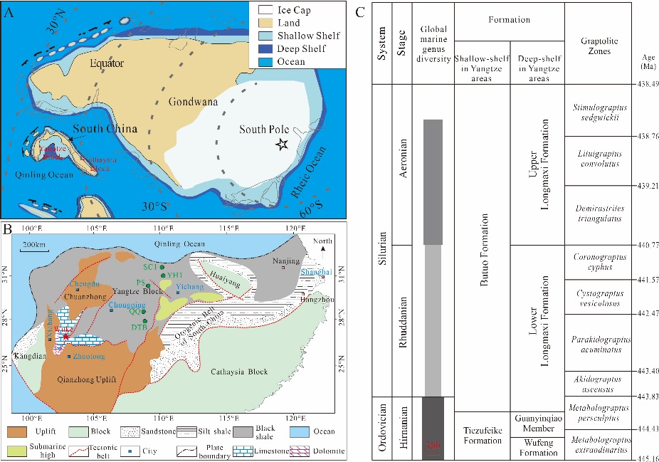 图1 (A)早志留世时期冈瓦纳、华南板块古地理图;(B)早志留世时期华南扬子地区岩相古地理图;(C)晚奥陶世-早志留世华南扬子地区地层、笔石带分布图
