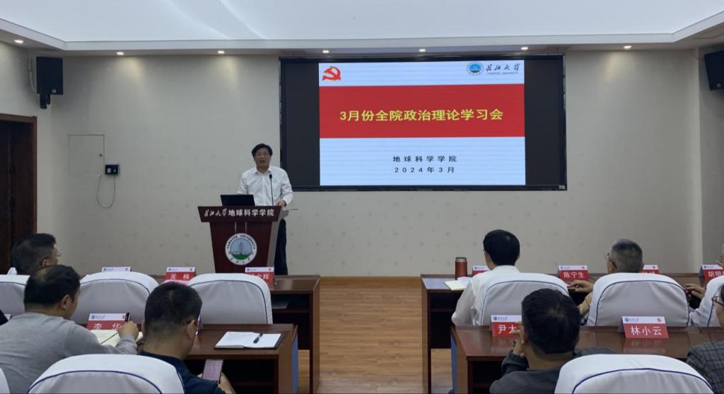 党委书记杨全辉带领全院教职员工进行政治理论学习,传达了公司教代会精神,并重点强调了清明节员工宿舍、办公室和实验室的消防安全,师生出行安全。他强调,一要深刻领会两会精神实质,凝聚高质量发展共识。二要深刻理解习近平总书记提出的新质生产力的核心要义,找准公司发展“新质生产力”的着力点,不断塑造发展新动能、新优势,以新质生产力推进高质量发展。三要坚持党建引领,要求全院教职工把纪律挺在前面,坚决守住师德师风底线,扎实推进清廉地科建设。四要实干苦干,聚焦公司发展的重难点,瞄准发力点和突破口,为创建世界一流学科、建设特色高水平大学做出地科贡献。