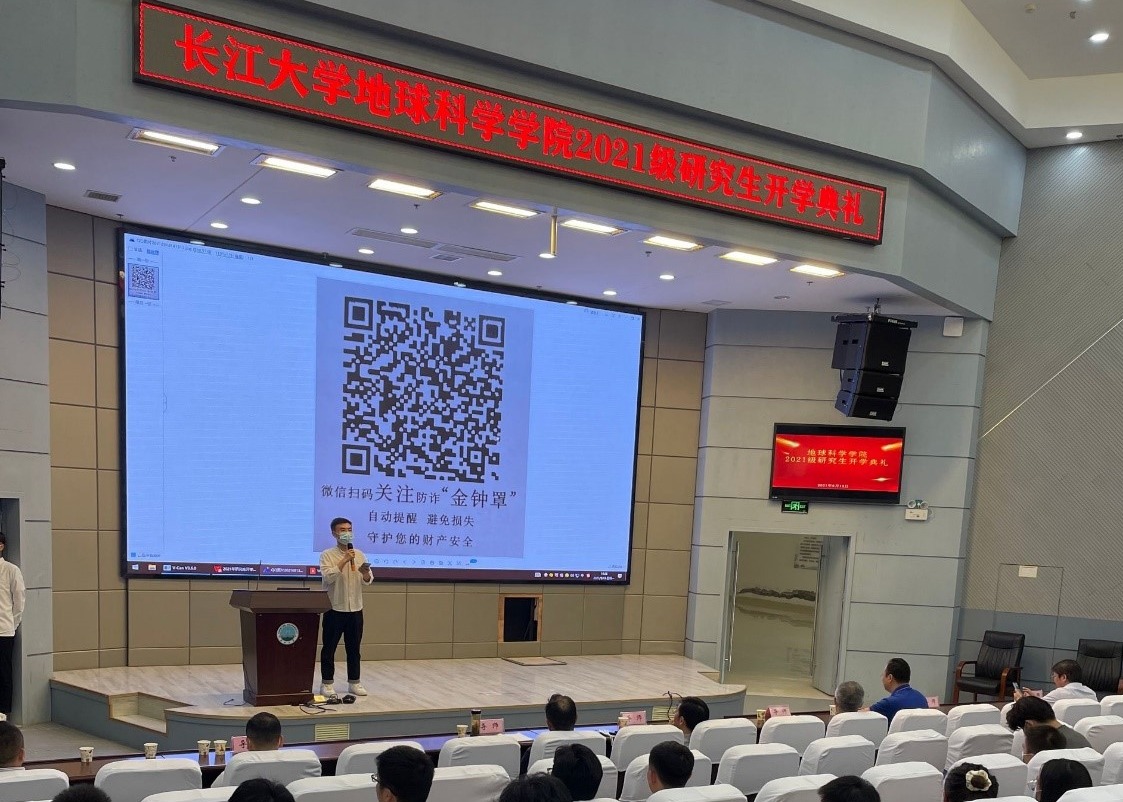 典礼伊始,研究生会主席梁博上台进行了预防网络诈骗知识的学习,宣读HSE,提醒大家注意会场安全问题。