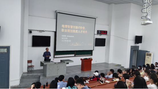 刘宏恺于1998年毕业于武汉测绘科技大学地图学专业,有着23年的GIS从业经历。本次讲座由荆轲刺秦王,霍乱事件开始,引导出了地图的重要性,让全体师生耳目一新的了解到地图的多种用途。然后主讲人从三个方面开展了报告,分别是“地理智慧金字塔”,“GIS行业与GIS技术”,“超图教育,企业文化与人才培养”。