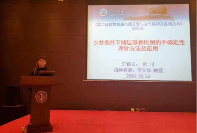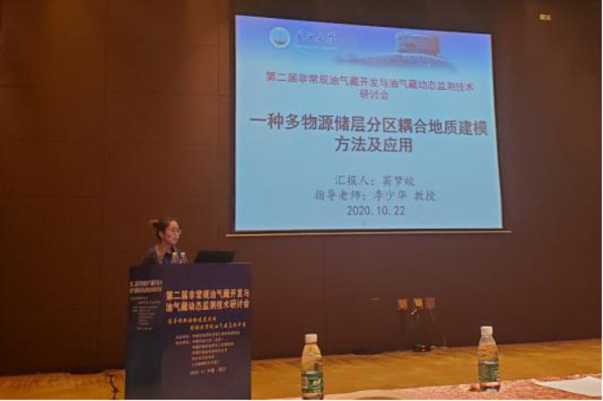 公司派出9名硕士研究生及3名本科生参加了本次研讨会,会上,2019级硕士杜川、窦梦皎与2020级贾云倩受邀在分会场做口头报告。杜川建立了一种少井条件下沉积微相所占比例不确定性的评价方法,在此基础上建立了研究区的微相模型,并以M气田为例开展实例研究,建议采用随机井结构方式确定微相比例的不确定性分布范围。窦梦皎提出了一种多物源储层分区耦合地质建模方法,以东营凹陷盐家油田沙四上亚段Y935-936区块为例进行应用研究,解决了传统分区建模方法带来的各区块间砂体突变的问题,提高了建模的质量。贾云倩借助储层微观结构演化及数字表征实验室平台,以威远志留系龙马溪组页岩储层为例,基于无损样品的二维大区域多尺度组合电镜成像(MAPS)表征技术,对有机质类型进行判别及解析其垂向分布规律,并对其主控机制进行分析。精彩的报告充分展示了公司学子的专业素养与风采,受到参会专家学者高度评价。