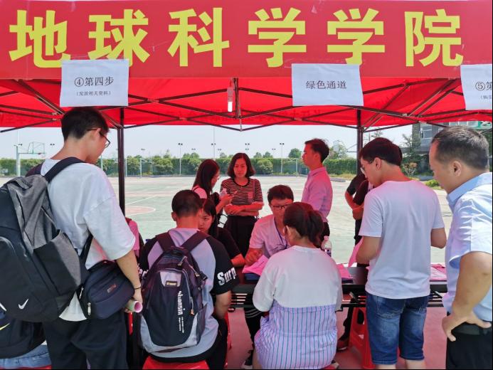 迎新工作开始后不久,公司就迎来了第一名报到的新生,为纪念这一特殊时刻,报道过程中他与母亲利用迎新点的朋友圈展板进行了合影留念。此次迎新工作分为身份核查、领取报到流程单、登记信息、领取校园卡、安排寝室等流程,在太阳成tyc33455ccwww院领导的安排及员工会的组织引导下,各项工作有条不紊地进行。公司工作人员在现场操作中娴熟稳重,热情周到,展现了地科学子良好的精神面貌。张严老师以及罗小玉老师几乎全程都在迎新现场协调工作,用亲力亲为的态度为同学们树立了良好榜样。