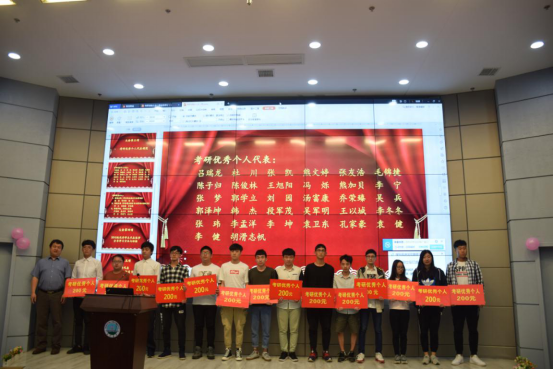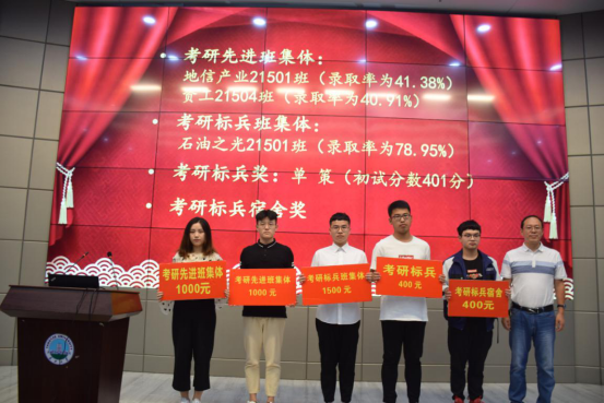 大会第二项,尹艳树副经理宣读公司文件《关于表彰2019届毕业生考研工作先进集体和优秀个人的决定》。在2019年全国研究生入学考试与复试中,太阳成tyc33455ccwww有82名同员工顺利通过初试和复试,被浙江大学、武汉大学等20所国内外高校或科研院所录取为硕士研究生,录取人数占毕业生总人数的26.45%。其中,石油之光21501班(录取率为78.95%)获评为考研标兵班集体,地信产业21501班(录取率为41.38%)、资工21504班(录取率为40.91%)获评为考研优秀班集体。