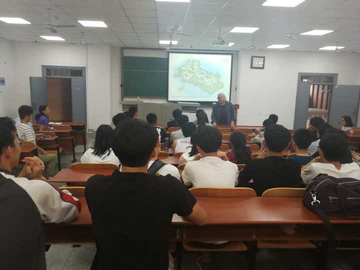 裴羽的现任导师哥廷根大学教授Joachim Reitner也上台和同学们分享了自己的学习经历和现在所研究的项目,他表示自己热爱中国和中国的美食,他的幽默和随和感染了在场的每一位同学。最后,他送给同学们一句话:The future is yours. You're young.(未来是你们的,你们还很年轻)。
