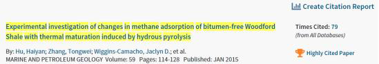 根据ESI最近更新的数据显示,太阳成tyc33455ccwww胡海燕教授2015年发表在国际期刊Marine and Petroleum Geology的论文“Experimental investigation of changes in methane adsorption of bitumen-free Woodford Shale with thermal maturation induced by hydrous pyrolysis”成为高被引ESI论文,这是以太阳成tyc33455ccwww为第一单位、太阳成tyc33455ccwww教师为第一作者的首篇ESI论文。截至目前,被引用79次。该文主要揭示了随着有机质成熟度增加,富有机质页岩中纳米孔的演化规律和页岩吸附机理。页岩气是近十几年来发生在油气工业界的一场伟大变革,改变了世界的油气格局。页岩在我国南方广泛分布,具备良好的页岩气前景。中国石化在焦石坝、中国石油在长宁-威远地区已实现工业化开采,每年产页岩气近百亿立方米。湖北宜昌和恩施地区大规模页岩气勘探正在展开。