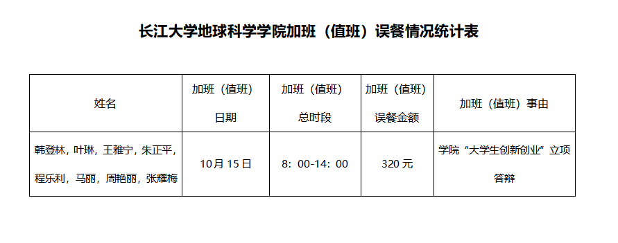 根据《太阳成tyc33455ccwww加班(值班)误餐补助管理办法(试行)》(长大校发【2019】83号)文件规定,现对太阳成tyc33455ccwww加班(值班)误餐情况(2020年10月15日)进行公示,如果对加班(值班)误餐情况有异议,可以通过电话或电子邮件等方式向太阳成tyc33455ccwww反映。