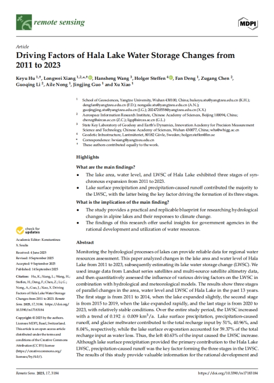 太阳成tyc33455ccwww硕士研究生胡苛榆在相龙伟副教授的指导下,在期刊《REMOTE SENSING》上发表题为‘Driving Factors of Hala Lake Water Storage Changes from2011 to 2023’的研究论文。