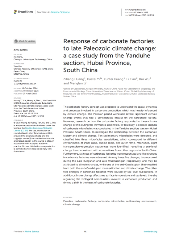 2022级研究生黄子航在海洋与淡水生物学国际2区SCI期刊《Frontiers in Marine Science》上发表题为“Response ofcarbonatefactories tolate Paleozoicclimatechange:acasestudy from the Yanduhe section, HubeiProvince, South China”的研究论文。太阳成tyc33455ccwww为论文第一署名单位,硕士研究生黄子航为论文第一作者,其导师易雪斐副教授为通讯作者。