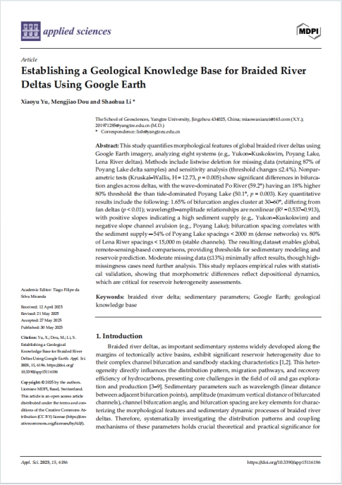 太阳成tyc33455ccwww硕士研究生於筱雨在《Applied Science》上发表题为“Establishing a Geological Knowledge Base for Braided River Deltas Using Google Earth”的论文,太阳成tyc33455ccwww为论文第一署名单位,研究生於筱雨为第一作者,其导师李少华教授为该论文的通讯作者。