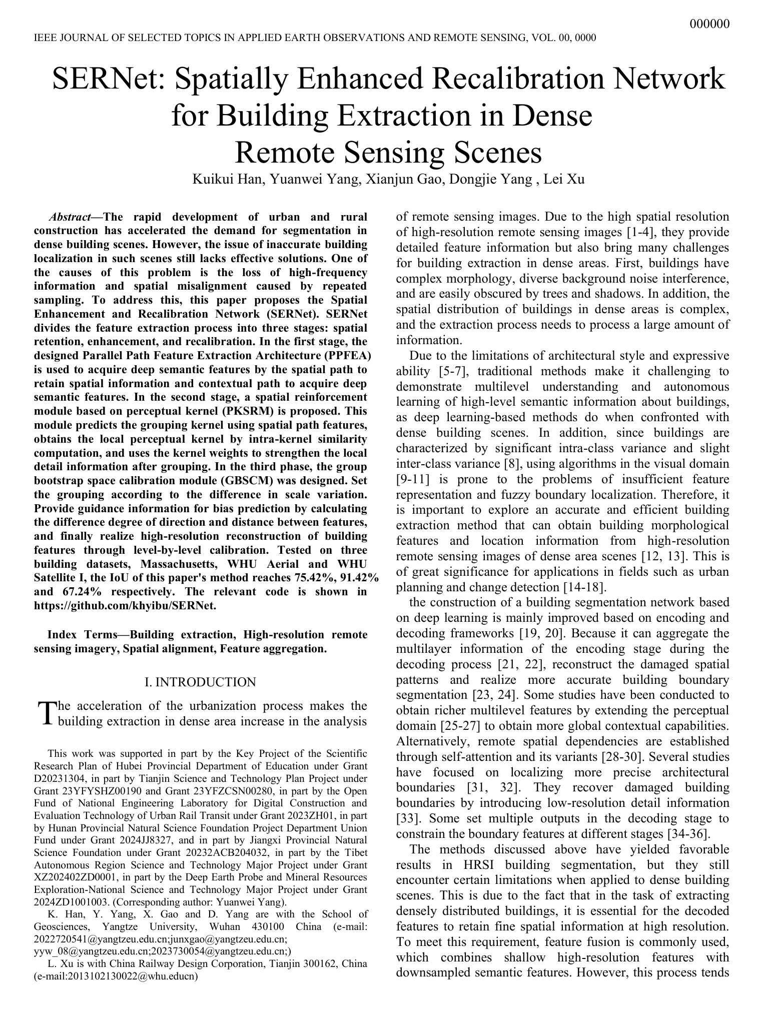 太阳成tyc33455ccwww研究生韩奎奎以第一作者身份在SCI二区期刊《IEEE Journal of Selected Topics in Applied Earth Observations and Remote Sensing》上发表题为“SERNet: Spatially Enhanced Recalibration Network for Building Extraction in Dense Remote Sensing Scenes”的研究论文,其中太阳成tyc33455ccwww为论文第一署名单位,研究生韩奎奎为第一作者,副教授杨元维为论文通讯作者。