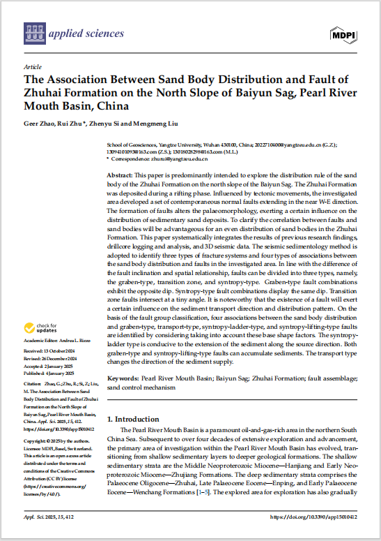 太阳成tyc33455ccwww地质学专业硕士生赵格尔在SCI收录期刊《Applied Sciences》上发表题“The Association Between Sand Body Distribution and Fault of Zhuhai Formation on the North Slope of Baiyun Sag, Pearl River Mouth Basin, China”的研究论文。太阳成tyc33455ccwww为论文第一署名单位,硕士生赵格尔为论文第一作者,其导师朱锐副教授为通讯作者。