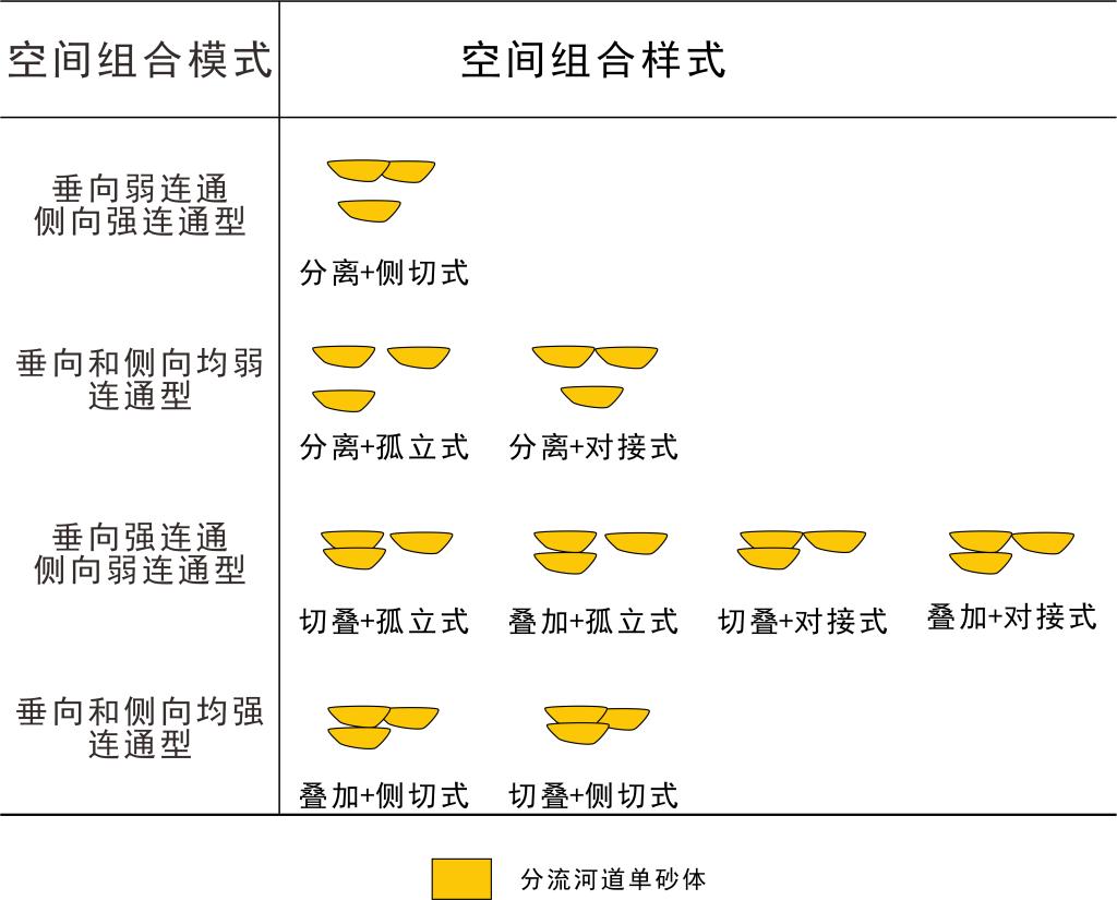 文章认为:①研究区单砂体在垂向上的叠置关系主要有分离式、叠加式以及切叠式3种,在侧向上的接触类型主要有孤立型、侧切型及对接型3种;②共存在4种空间组合模式,9种空间组合样式,以分离+侧切式和叠加+侧切式为主;③垂向及侧向连通较弱砂体的剩余油富集在上方砂体侧翼与下方砂体顶部,侧向连通性较弱砂体的剩余油富集在上方砂体侧翼,连通性较强的砂体剩余油不富集。
