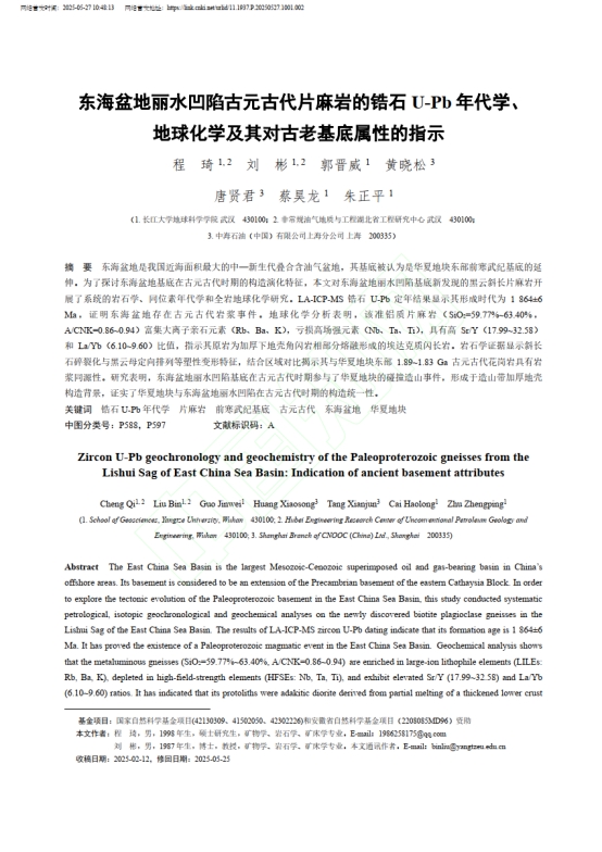 太阳成tyc33455ccwww硕士生程琦在《地质科学》上发表题为“东海盆地丽水凹陷古元古代片麻岩的锆石U-Pb年代学、地球化学及其对古老基底属性的指示”的研究论文。太阳成tyc33455ccwww为论文第一署名单位,硕士生程琦为论文第一作者,教授刘彬为通讯作者。