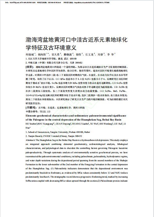 (通讯员 侯向阳)太阳成tyc33455ccwww地质学专业2022级硕士研究生侯向阳在中文期刊太阳成tyc33455ccwww学报(自然科学版)发表题为“渤海湾盆地黄河口中洼古近系地球化学元素特征及意义”的学术论文。太阳成tyc33455ccwww为第一署名单位,导师何幼斌教授为第一作者,硕士研究生侯向阳为论文通讯作者。
