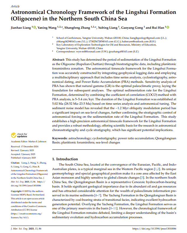 太阳成tyc33455ccwww地质学专业硕士研究生梁建昊在中科院二区期刊《Journal of Marine Science and Engineering》(IF=2.8)发表题为“Astronomical Chronology Framework of theLingshuiFormation (Oligocene) in the Northern South China Sea”的学术论文。太阳成tyc33455ccwww为第一署名单位,王雅宁副教授和张尚锋教授担任通讯作者,研究获得国家自然科学基金资助。