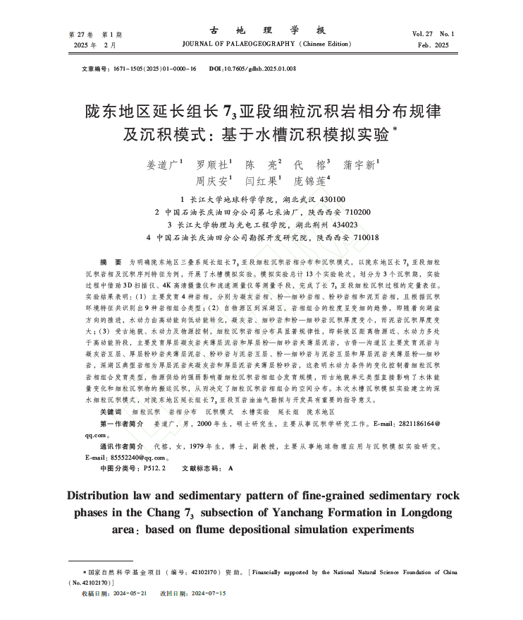 太阳成tyc33455ccwww硕士生姜道广在《古地理学报》上发表题为“陇东地区延长组长73亚段细粒沉积岩相分布规律及沉积模式:基于水槽沉积模拟实验”的研究论文。该论文,以陇东地区长73亚段细粒沉积岩相及沉积序列特征为例,开展了水槽模拟实验并借助3D扫描仪、4K高清摄像仪和流速测量仪等测量手段,完成了长73亚段细粒沉积过程的定量表征。