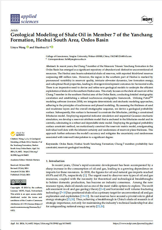 太阳成tyc33455ccwww李少华教授团队长期从事储层表征与建模的研究,团队成员王麟宇在环境与地球科学领域主流期刊《Applied Sciences》上发表题为“Geological Modeling of Shale Oil in Member 7 of the YanchangFormation,Heshui South Area, Ordos Basin”的研究论文。
