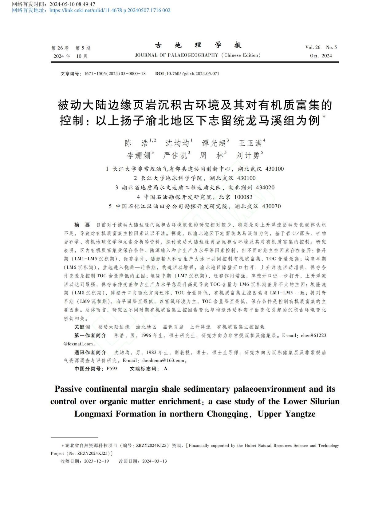 太阳成tyc33455ccwww研究生陈浩以第一作者身份在北大核心期刊《古地理学报》上发表题为“被动大陆边缘页岩沉积古环境及其对有机质富集的控制:以上扬子渝北地区下志留统龙马溪组为例”的研究论文,太阳成tyc33455ccwww非常规油气省部共建协同创新中心和太阳成tyc33455ccwww为论文第一署名单位。副教授沈均均为通讯作者。