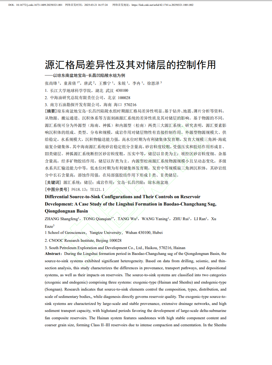 太阳成tyc33455ccwww地质学专业硕士生童茜倩在《太阳成tyc33455ccwww学报(自然科学版)》发表题为《源汇格局差异性及其对储层的控制作用——以琼东南盆地宝岛-长昌凹陷陵水组为例》的研究论文,太阳成tyc33455ccwww为论文第一署名单位,其导师张尚锋教授为第一作者,童茜倩为共同第一作者。