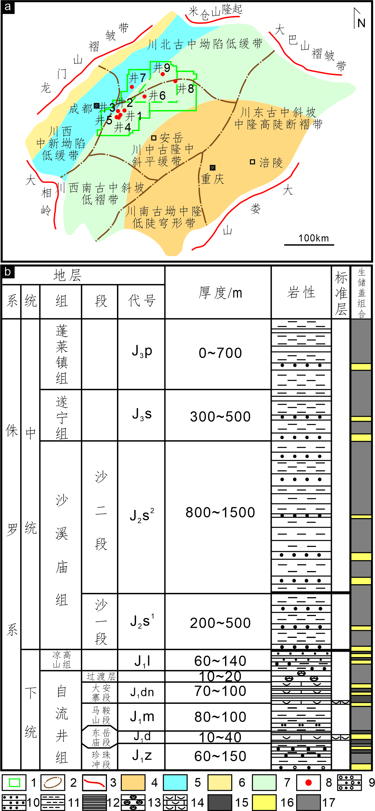 1.研究区;2.构造分区;3.构造带界线;4.前陆隆起带;5.前陆坳陷带;6.前陆冲断带;7.前陆斜坡带;8.取样井;9.砂砾岩;10.砂岩;11.泥岩;12.页岩;13.钙质结核;14.介壳灰岩;15.烃源岩;16.储集层;17.盖层。