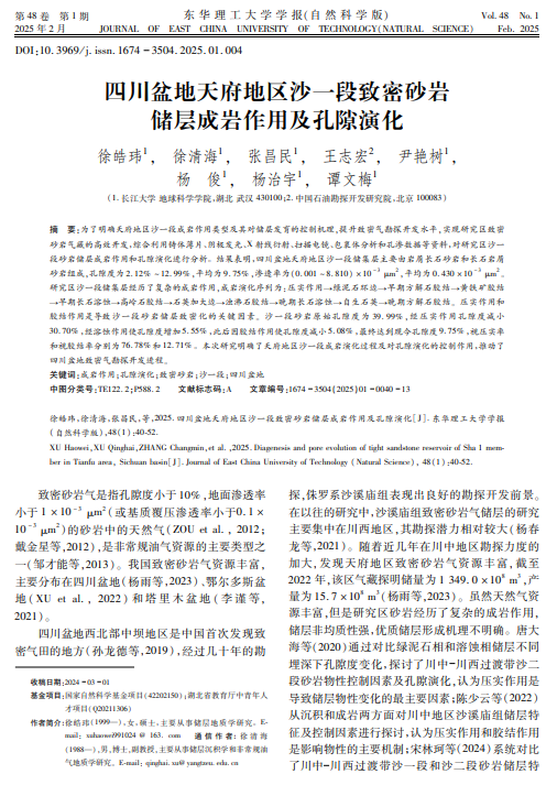 太阳成tyc33455ccwww硕士生徐皓玮在期刊《东华理工大学学报(自然科学版)》上发表题为“四川盆地天府地区沙一段致密砂岩储层成岩作用及孔隙演化”的研究论文。太阳成tyc33455ccwww为论文第一署名单位,徐清海副教授为通讯作者。