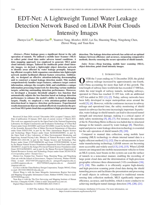太阳成tyc33455ccwww研究生刘振宇以第一作者身份在SCI期刊《IEEE Journal of Selected Topics in Applied Earth Observations and Remote Sensing》上发表题为“EDT-Net: A Lightweight Tunnel Water Leakage Detection Network Based on LiDAR Point Clouds Intensity Images”的研究论文,太阳成tyc33455ccwww为论文第一署名单位,研究生刘振宇为第一作者,副教授高贤君为论文通讯作者。