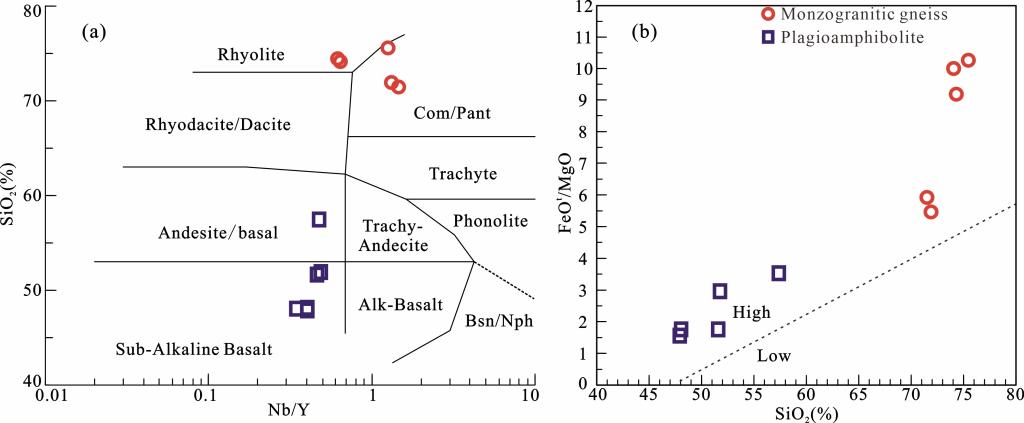 图2.大别造山带双峰式侵入岩的(a)Nb/Y-SiO₂图解(据Winchester和Floyd,1997)与(b)SiO₂-FeOt/MgO图解(据Miyashiro,1975)
