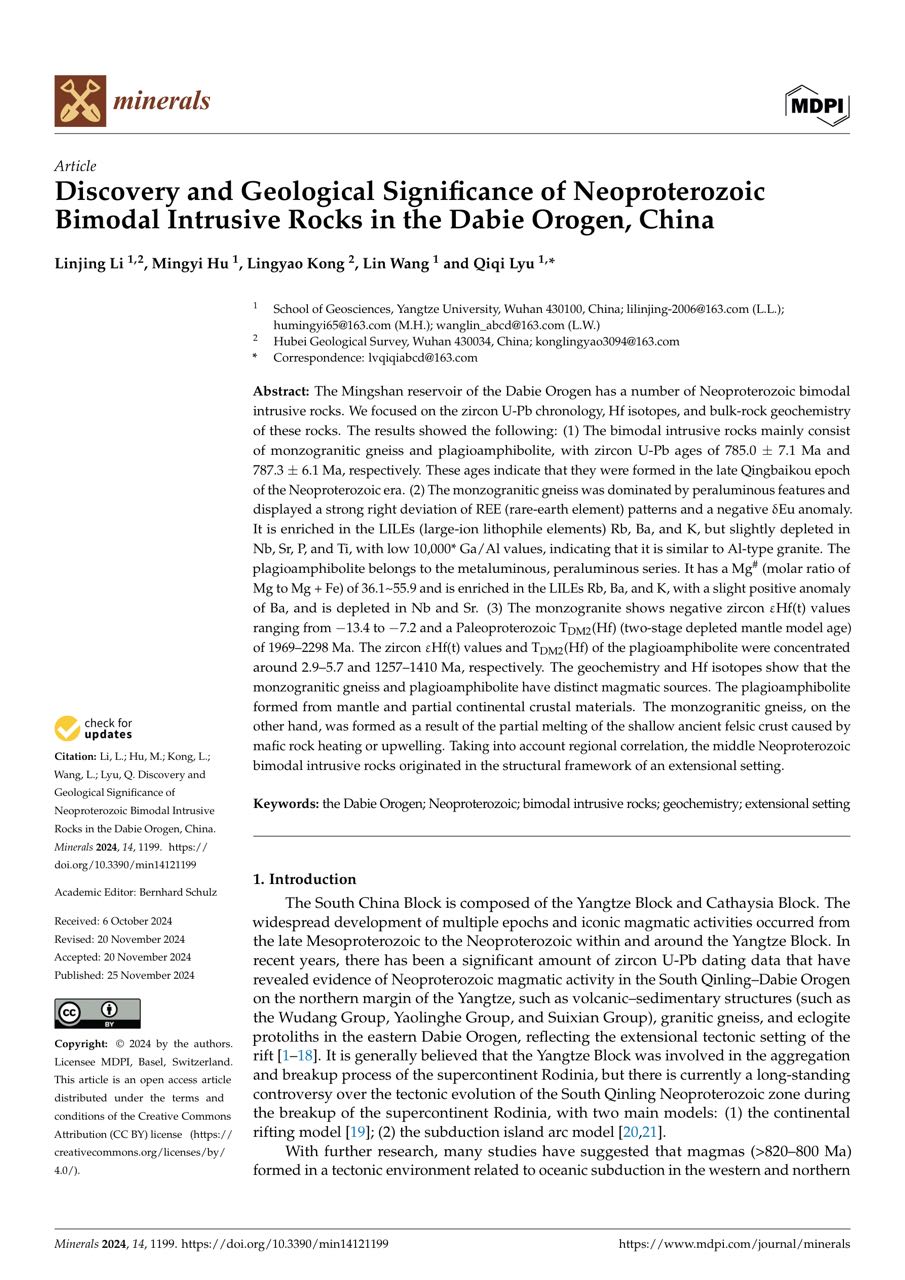 太阳成tyc33455ccwww地质系胡明毅教授团队长期从事地质学方向的研究。团队成员李琳静博士在期刊《Minerals》上发表题为《Discovery and Geological Significance of NeoproterozoicBimodal Intrusive Rocks in the Dabie Orogen, China》的研究论文,太阳成tyc33455ccwww为论文第一署名单位,博士生李琳静为论文第一作者。